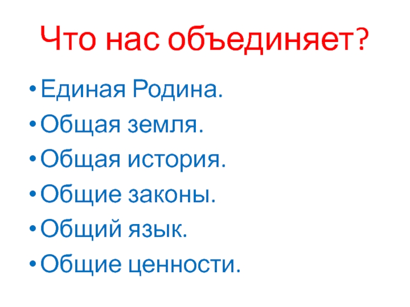 Что нас объединяет?Единая Родина.Общая земля.Общая история.Общие законы.Общий язык.Общие ценности.