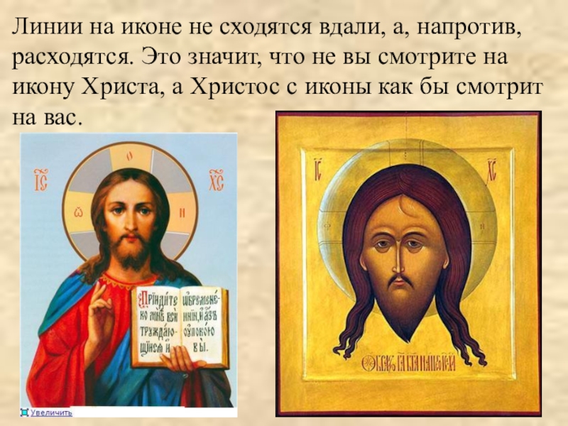 Слайд 8Линии на иконе не сходятся вдали, а, напротив, расходятся. Это значит,