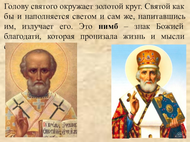 Слайд 5Голову святого окружает золотой круг. Святой как бы и наполняется светом