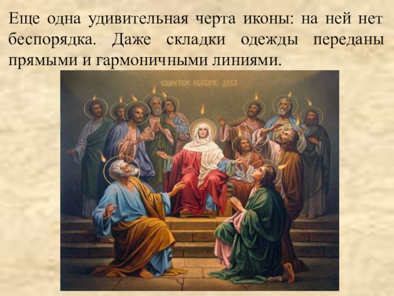 Слайд 6Еще одна удивительная черта иконы: на ней нет беспорядка. Даже складки