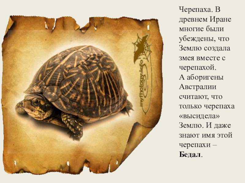 Слайд 14Черепаха. В древнем Иране многие были убеждены, что Землю создала змея
