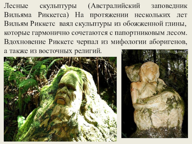 Слайд 16Лесные скульптуры (Австралийский заповедник Вильяма Риккетса) На протяжении нескольких лет Вильям