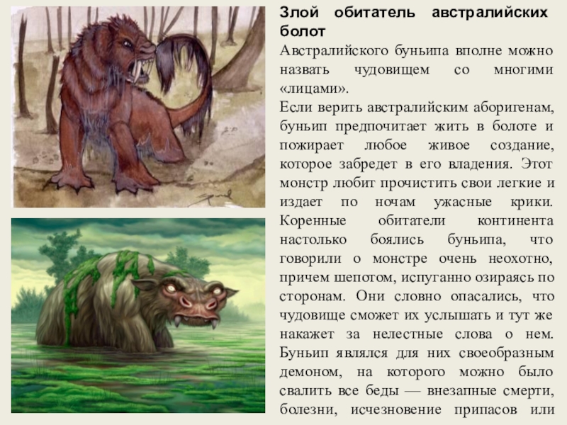 Буньип являлся для них своеобразным демоном, на которого можно было свалить все беды — внезапные смерти, болезни, исчезновение припасов или имущества..