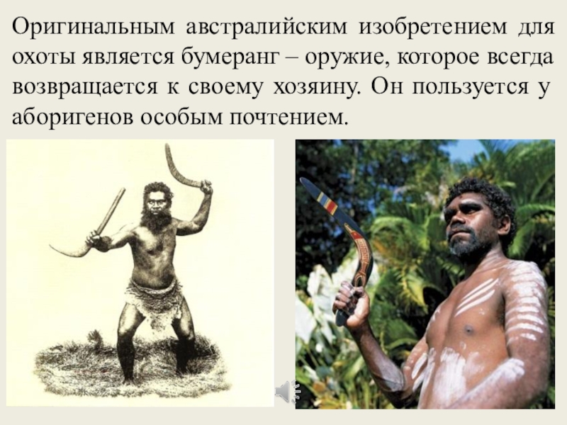 Слайд 4Оригинальным австралийским изобретением для охоты является бумеранг – оружие, которое всегда