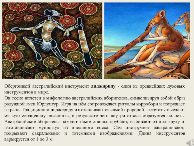Слайд 6Обертонный австралийский инструмент диджириду - один из древнейших духовых инструментов в