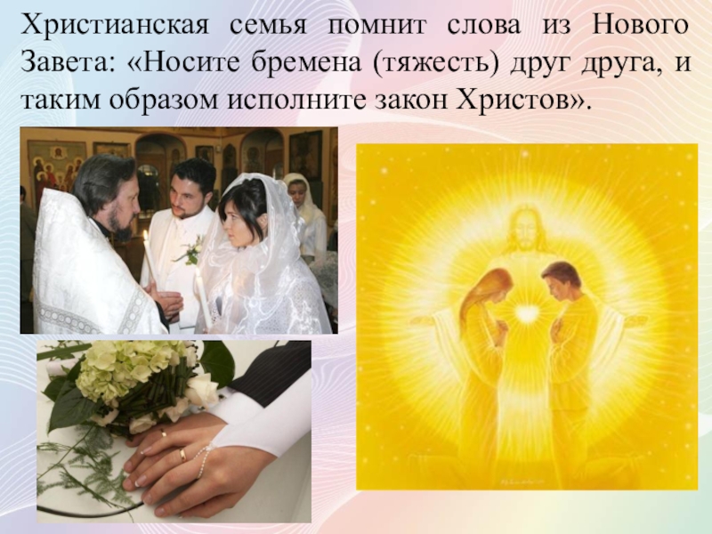 Слайд 9Христианская семья помнит слова из Нового Завета: «Носите бремена (тяжесть) друг
