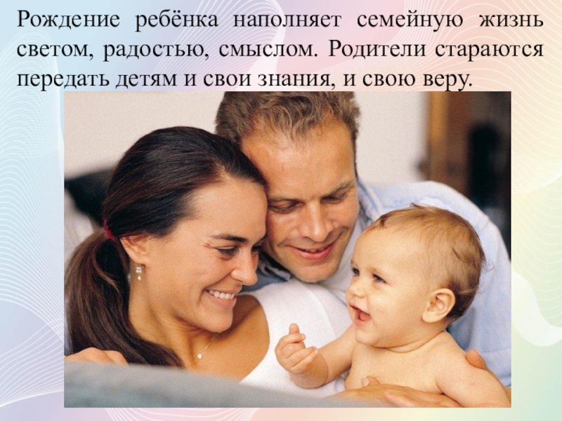 Слайд 10Рождение ребёнка наполняет семейную жизнь светом, радостью, смыслом. Родители стараются передать