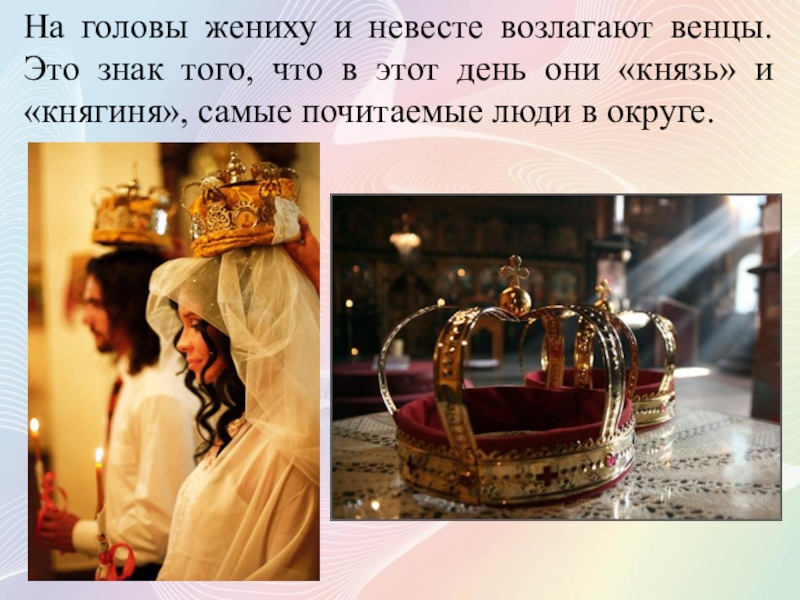 Слайд 5На головы жениху и невесте возлагают венцы. Это знак того, что