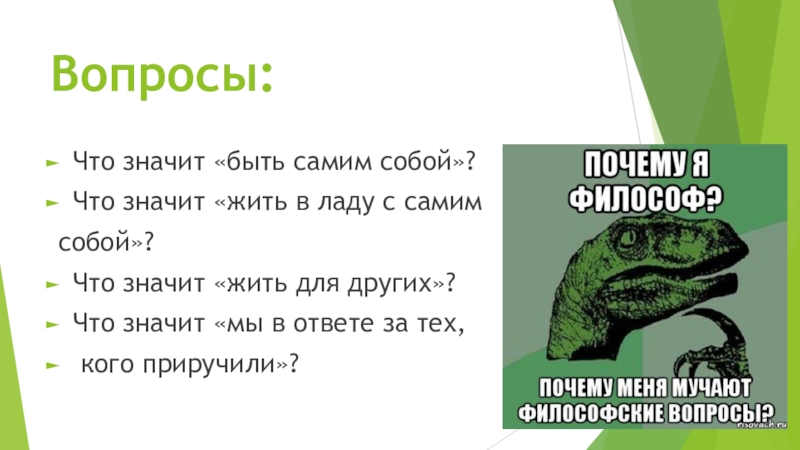 Вопросы:Что значит «быть самим собой»?Что значит «жить в ладу с самим собой»?Что значит «жить для других»?Что значит