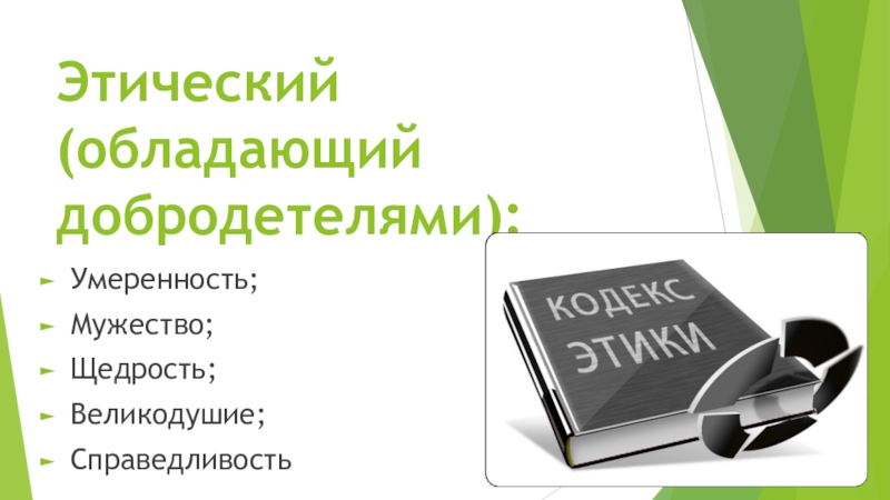 Этический (обладающий добродетелями):Умеренность;Мужество;Щедрость;Великодушие;Справедливость