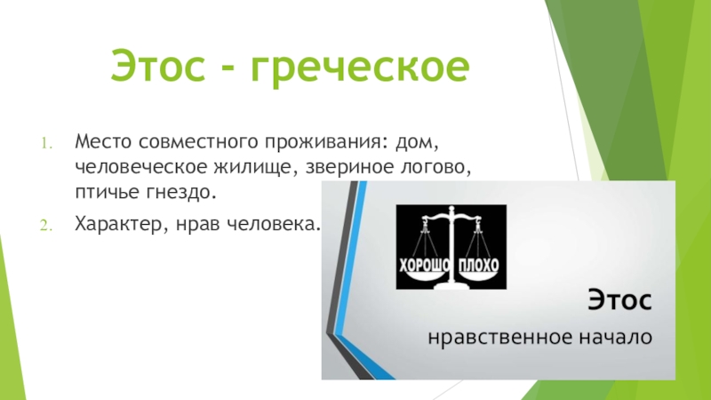 Этос - греческоеМесто совместного проживания: дом, человеческое жилище, звериное логово, птичье гнездо.Характер, нрав человека.