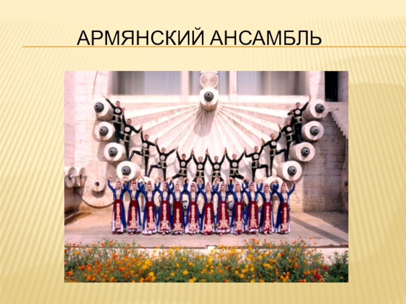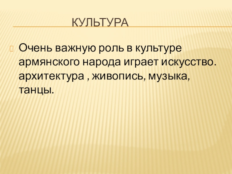 Очень важную роль в культуре армянского народа играет искусство. архитектура , живопись, музыка, танцы.