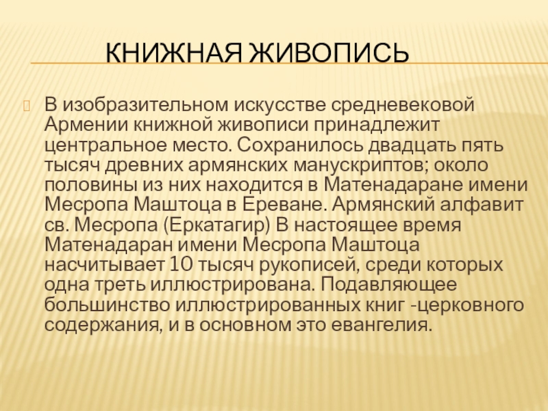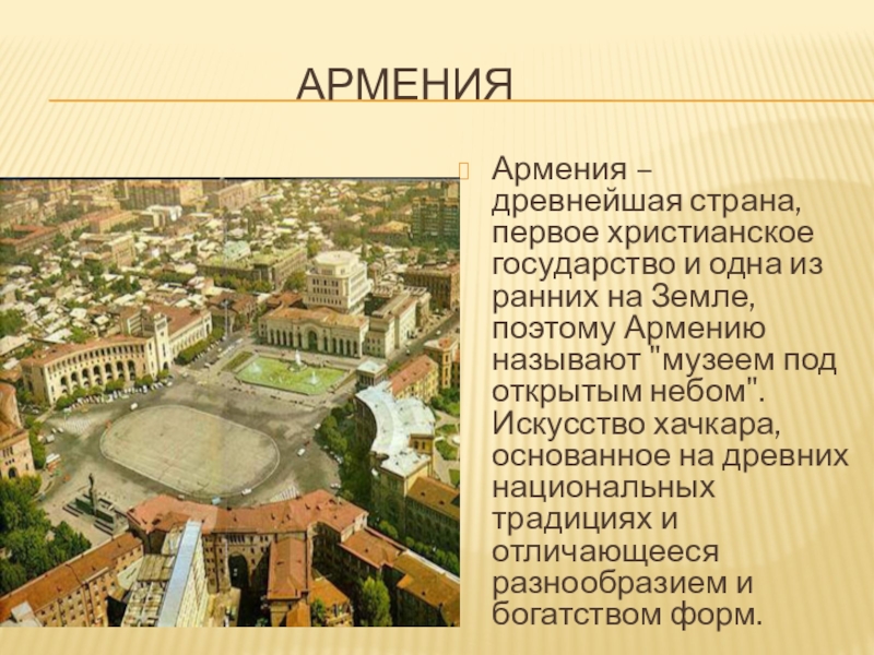 Армения – древнейшая страна, первое христианское государство и одна из ранних на Земле, поэтому Армению называют "музеем под открытым небом". Искусство хачкара, основанное на древних национальных традициях и отличающееся разнообразием и богатством форм.