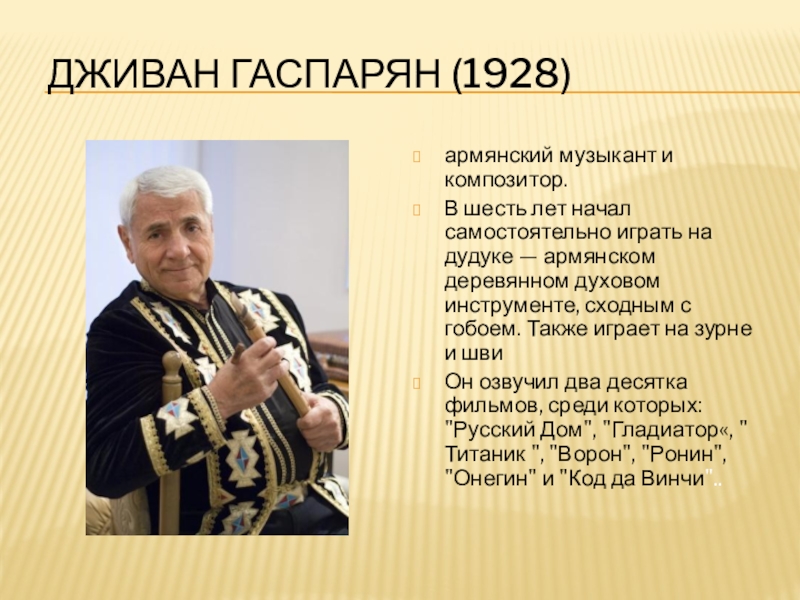 Очень ярко выражает в своей мелодии глубину душевной боли человека к своей стране, выпавшей доле и вообще всему самобытному. Услышав, хочется рассказать непосвященным, что музыка дудука –это то, как поют горы или разговаривают деревья, как плачут старики или радуются дети, сражаются воины или играются свадьбы…