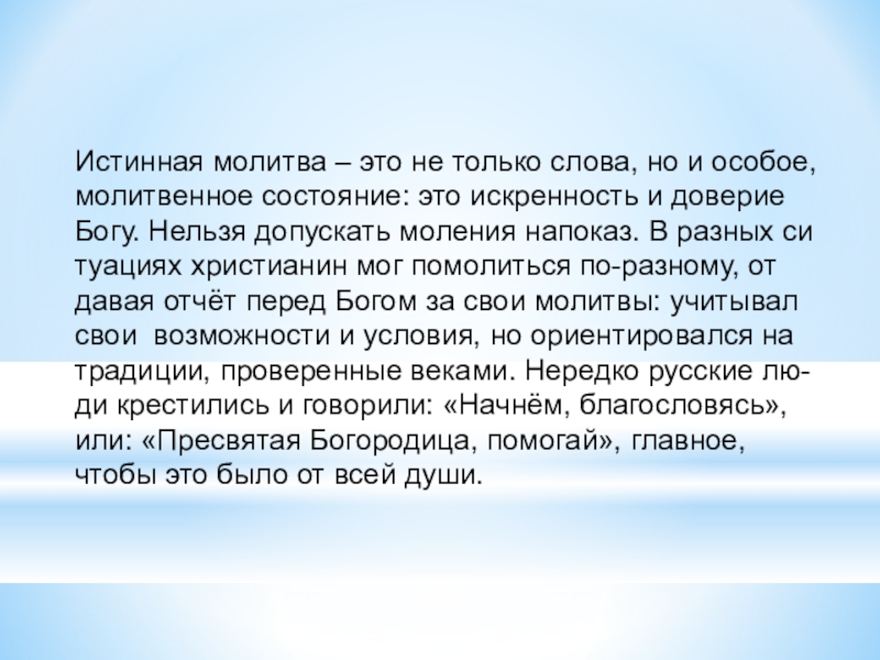 состояние: это искренность и доверие Богу. Нельзя допускать моления напоказ. В разных си туациях христианин мог помолиться по-разному, от давая отчёт перед Богом за свои молитвы: учитывал свои возможности и условия, но ориентировался на традиции, проверенные веками. Нередко русские лю- ди крестились и говорили: «Начнём, благословясь», или: «Пресвятая Богородица, помогай», главное, чтобы это было от всей души.