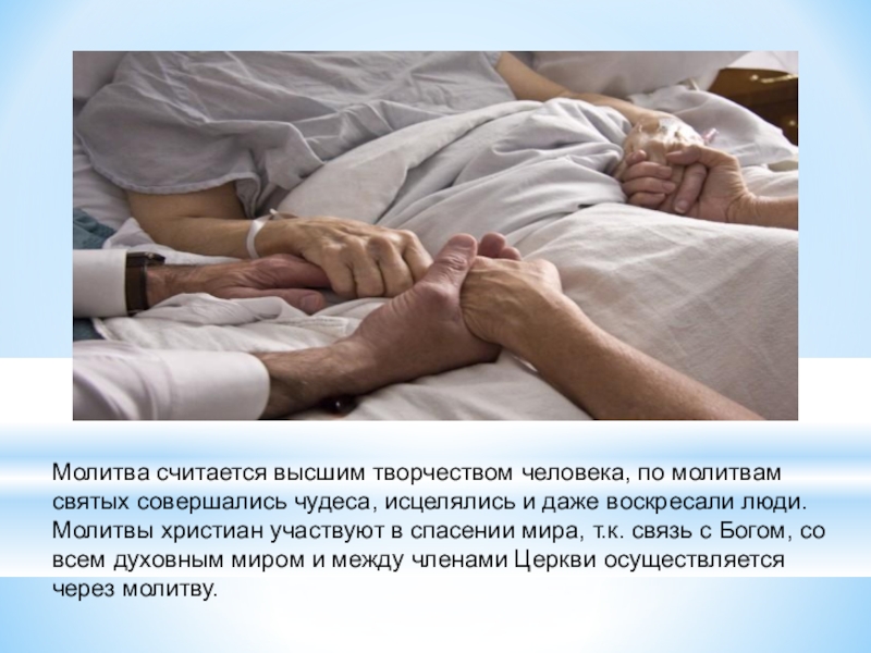 и даже воскресали люди. Молитвы христиан участвуют в спасении мира, т.к. связь с Богом, со всем духовным миром и между членами Церкви осуществляется через молитву.