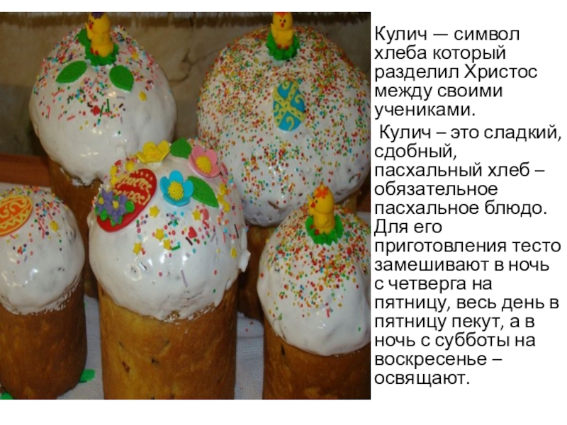 Слайд 12Кулич — символ хлеба который разделил Христос между своими учениками.