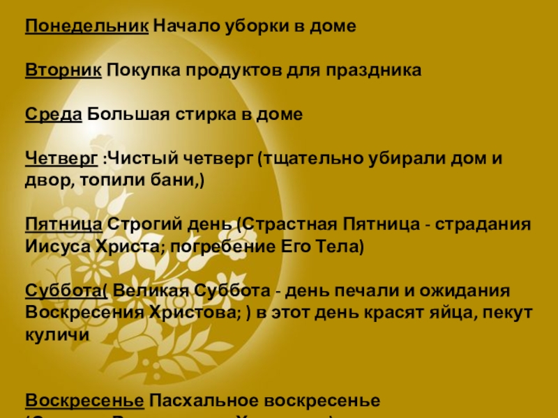 Четверг :Чистый четверг (тщательно убирали дом и двор, топили бани,)