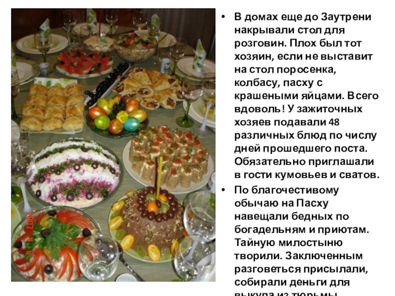 тот хозяин, если не выставит на стол поросенка, колбасу, пасху с крашеными яйцами. Всего вдоволь! У зажиточных хозяев подавали 48 различных блюд по числу дней прошедшего поста. Обязательно приглашали в гости кумовьев и сватов.