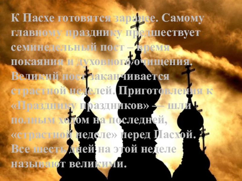 Слайд 6К Пасхе готовятся заранее. Самому главному празднику предшествует семинедельный пост –