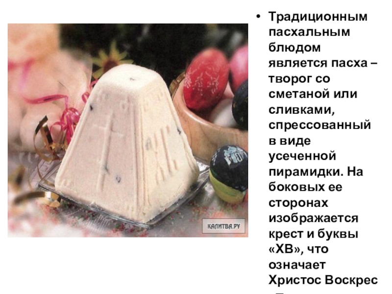 Слайд 11Традиционным пасхальным блюдом является пасха – творог со сметаной или сливками,