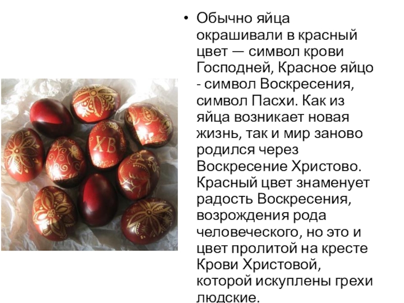Слайд 14Обычно яйца окрашивали в красный цвет — символ крови Господней, Красное