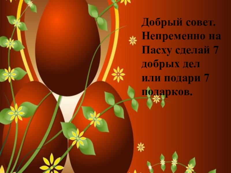 Слайд 15Добрый совет. Непременно на Пасху сделай 7 добрых дел или подари
