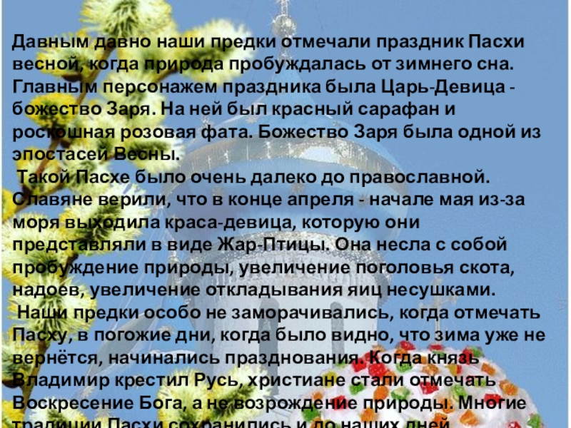 Слайд 4Давным давно наши предки отмечали праздник Пасхи весной, когда природа пробуждалась