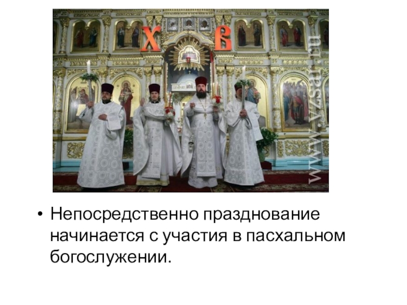 Слайд 8Непосредственно празднование начинается с участия в пасхальном богослужении.