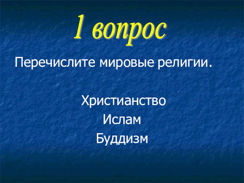 Перечислите мировые религии. ХристианствоИсламБуддизм1 вопрос