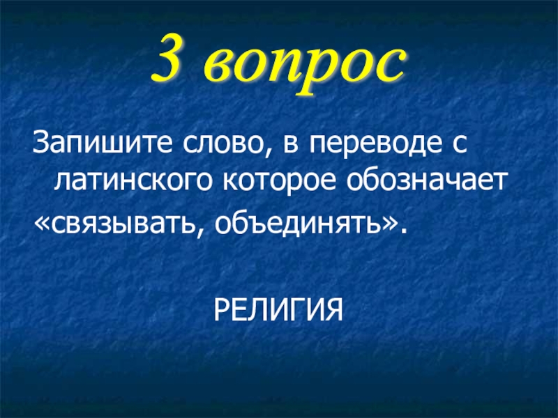 Запишите слово, в переводе с латинского которое обозначает«связывать, объединять».РЕЛИГИЯ3 вопрос