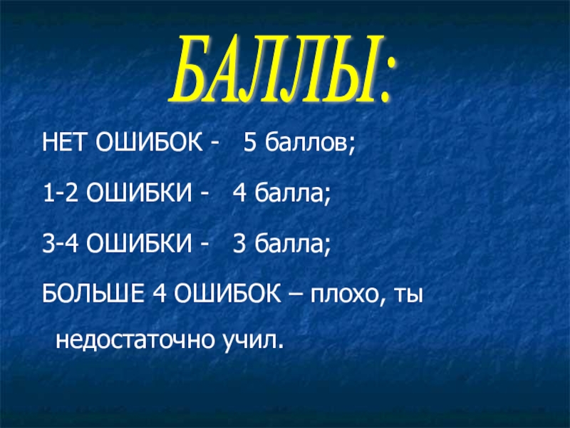 НЕТ ОШИБОК -  5 баллов; 1-2 ОШИБКИ -  4 балла; 3-4 ОШИБКИ -