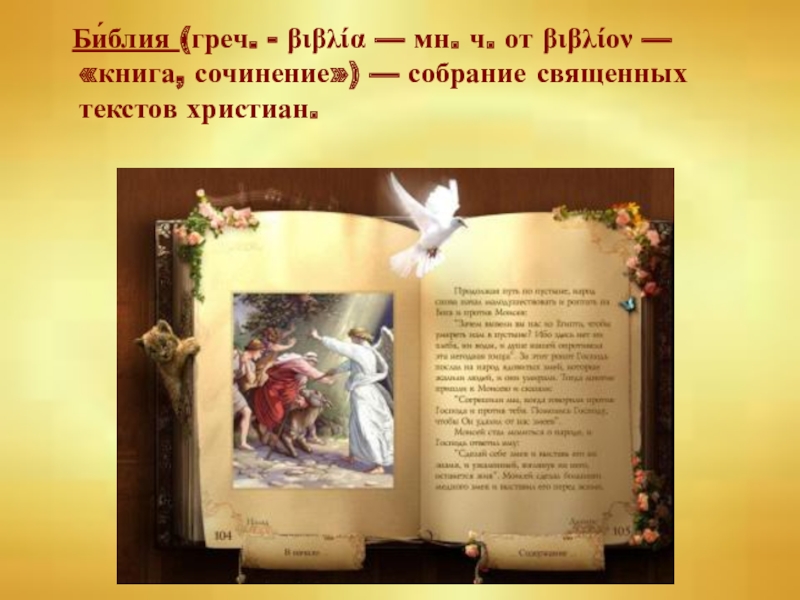 Слайд 6 Би́блия (греч. - βιβλία — мн. ч. от βιβλίον —