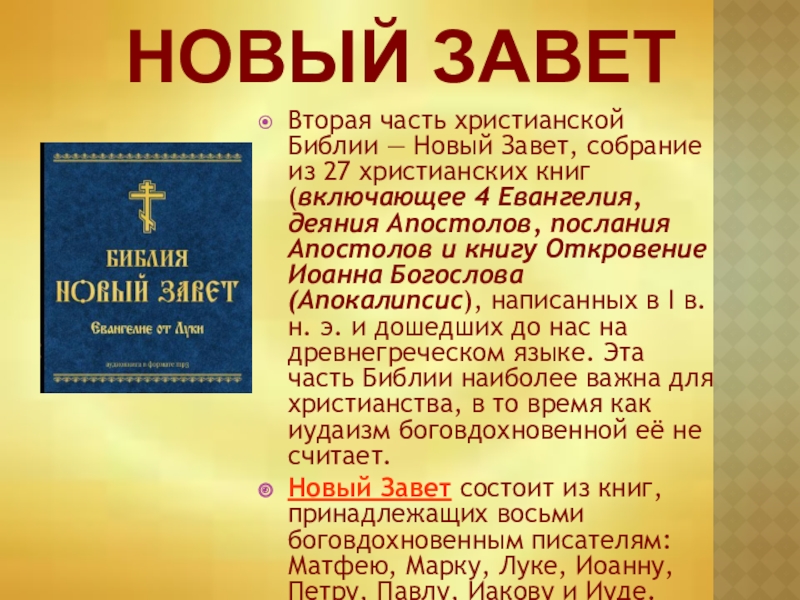 христианских книг (включающее 4 Евангелия, деяния Апостолов, послания Апостолов и книгу Откровение Иоанна Богослова (Апокалипсис), написанных в I в. н. э. и дошедших до нас на древнегреческом языке. Эта часть Библии наиболее важна для христианства, в то время как иудаизм боговдохновенной её не считает.