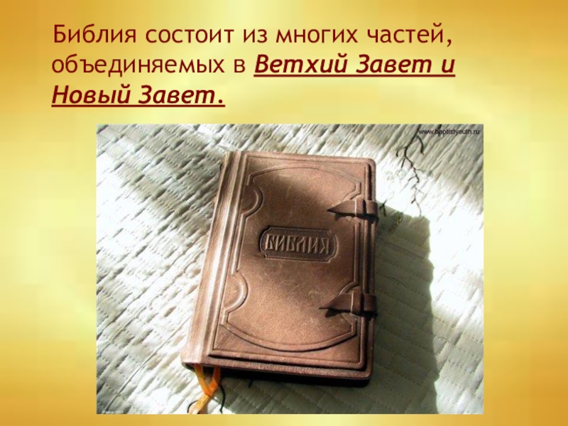Слайд 12 Библия состоит из многих частей, объединяемых в Ветхий Завет