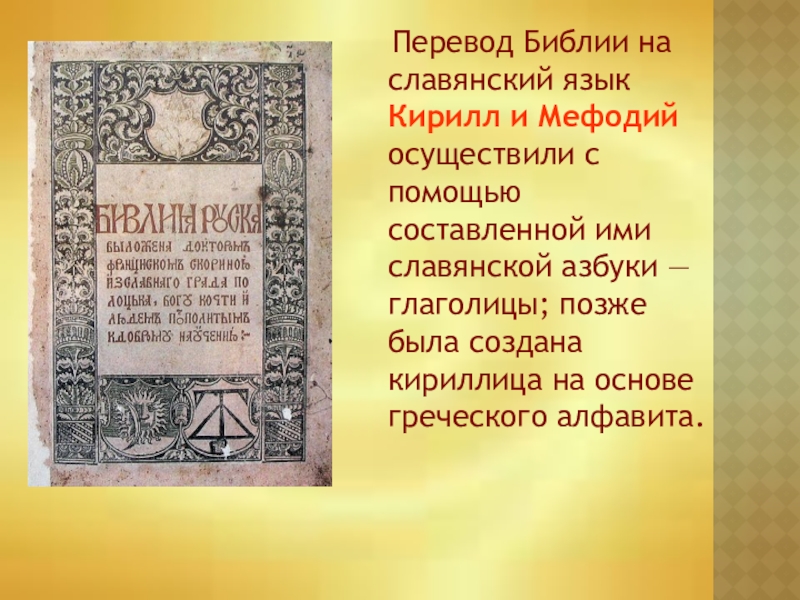 Слайд 9 Перевод Библии на славянский язык Кирилл и Мефодий осуществили