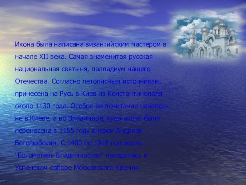 русская национальная святыня, палладиум нашего Отечества. Согласно летописным источникам, принесена на Русь в Киев из Константинополя около 1130 года. Особое ее почитание началось не в Киеве, а во Владимире, куда икона была перенесена в 1155 году князем Андреем Боголюбским. С 1480 по 1918 год икона "Богоматерь Владимирская" находилась в Успенском соборе Московского Кремля.