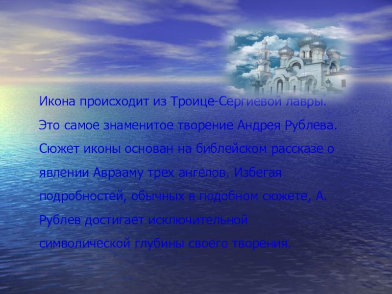 Слайд 8Икона происходит из Троице-Сергиевой лавры. Это самое знаменитое творение Андрея Рублева.