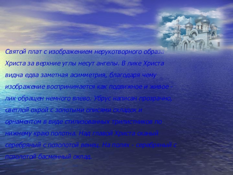 Слайд 6Святой плат с изображением нерукотворного образа Христа за верхние углы несут