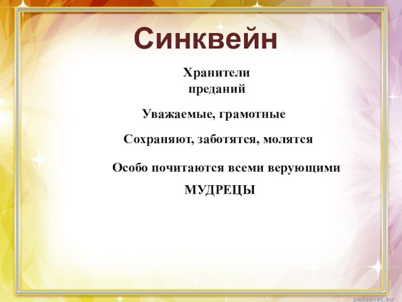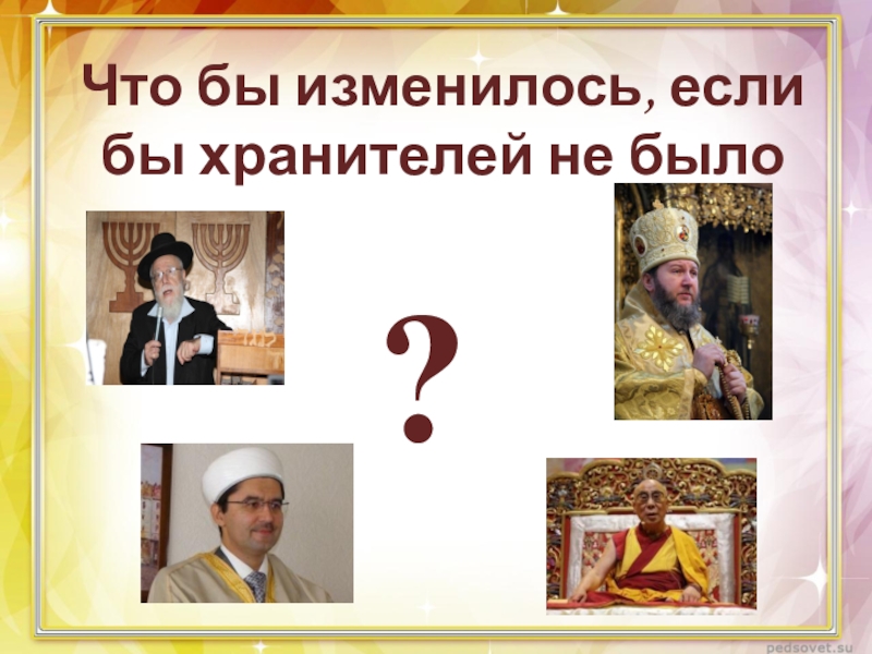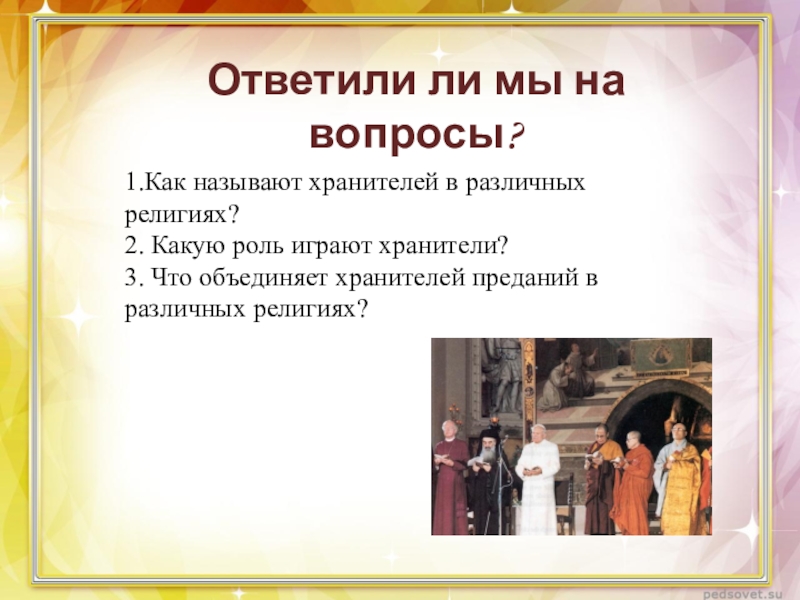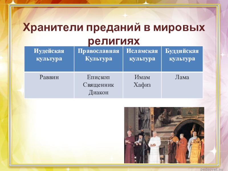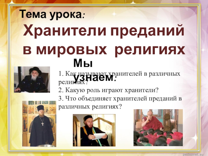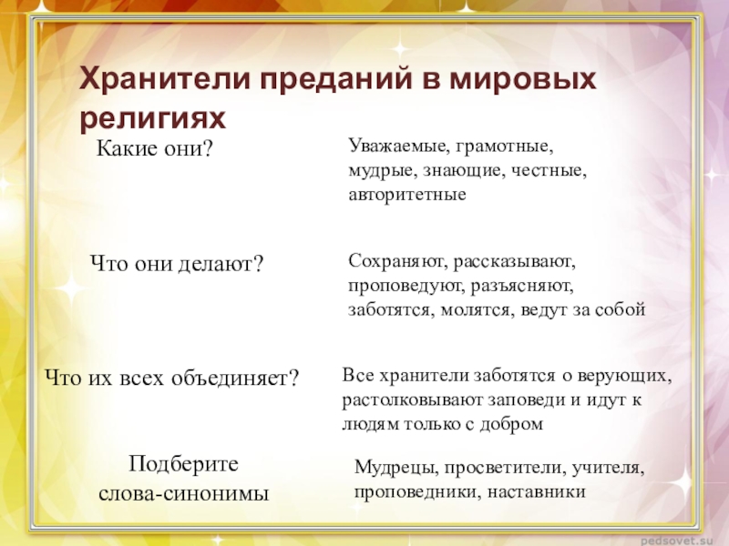Сохраняют, рассказывают, проповедуют, разъясняют, заботятся, молятся, ведут за собой