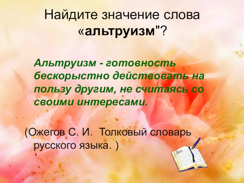 Найдите значение слова «альтруизм"? Альтруизм - готовность бескорыстно действовать на пользу другим, не считаясь со своими интересами.(Ожегов С. И. Толковый словарь русского языка. )