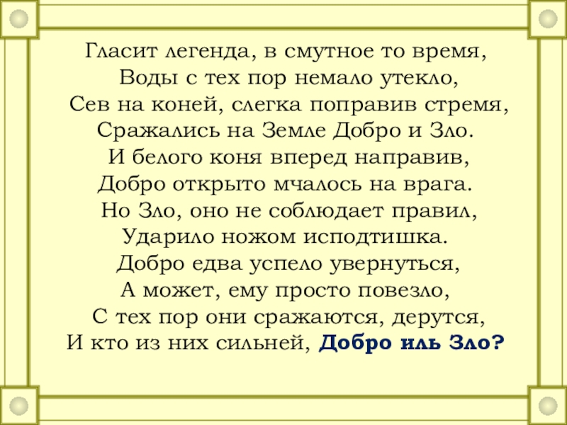 Гласит легенда, в смутное то время, Воды с тех пор немало утекло, Сев на коней, слегка поправив стремя, Сражались на Земле Добро и Зло. И белого коня вперед направив, Добро открыто мчалось на врага. Но Зло,