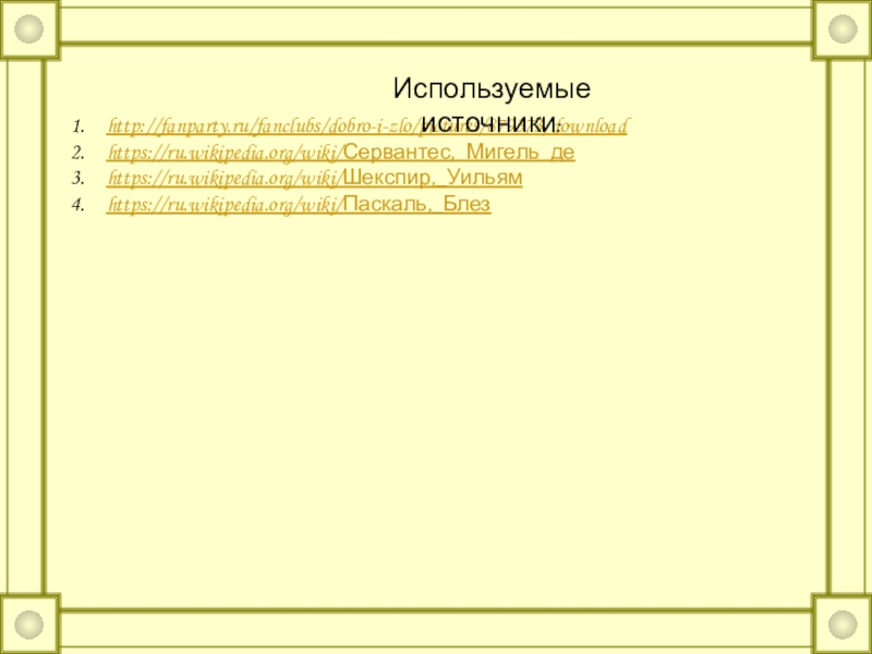 http://fanparty.ru/fanclubs/dobro-i-zlo/pictures/879373/downloadhttps://ru.wikipedia.org/wiki/Сервантес,_Мигель_деhttps://ru.wikipedia.org/wiki/Шекспир,_Уильямhttps://ru.wikipedia.org/wiki/Паскаль,_БлезИспользуемые источники: