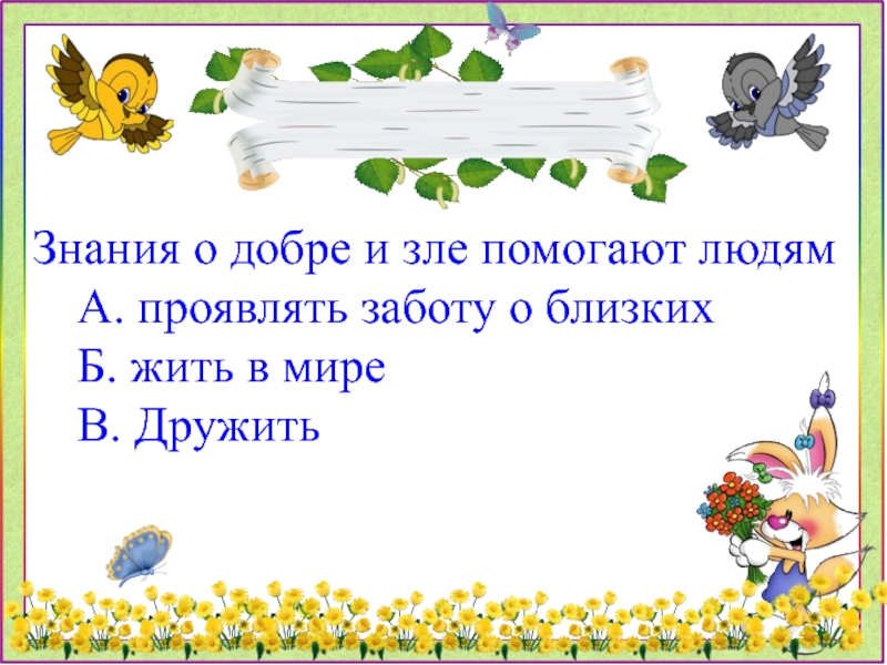 Знания о добре и зле помогают людям	А. проявлять заботу о близких	Б. жить в мире 	В. Дружить
