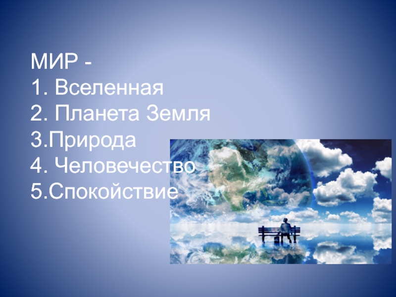 МИР - 1. Вселенная 2. Планета Земля 3.Природа 4. Человечество 5.Спокойствие