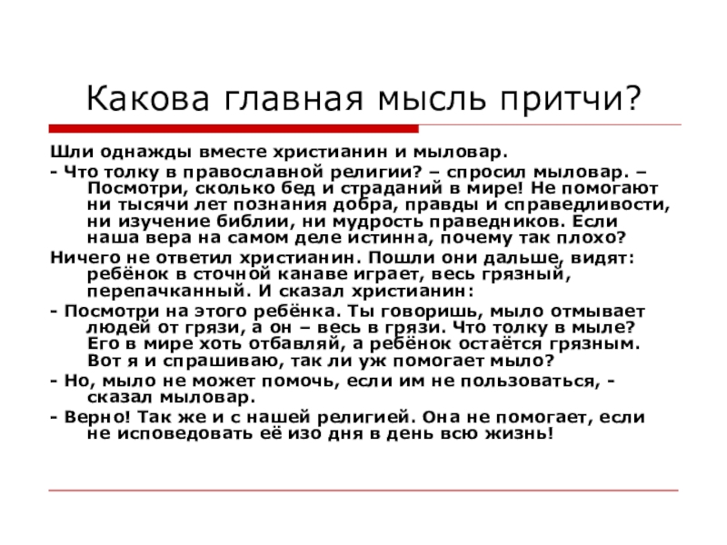 Какова главная мысль притчи? Шли однажды вместе христианин и мыловар.- Что толку в православной религии? – спросил