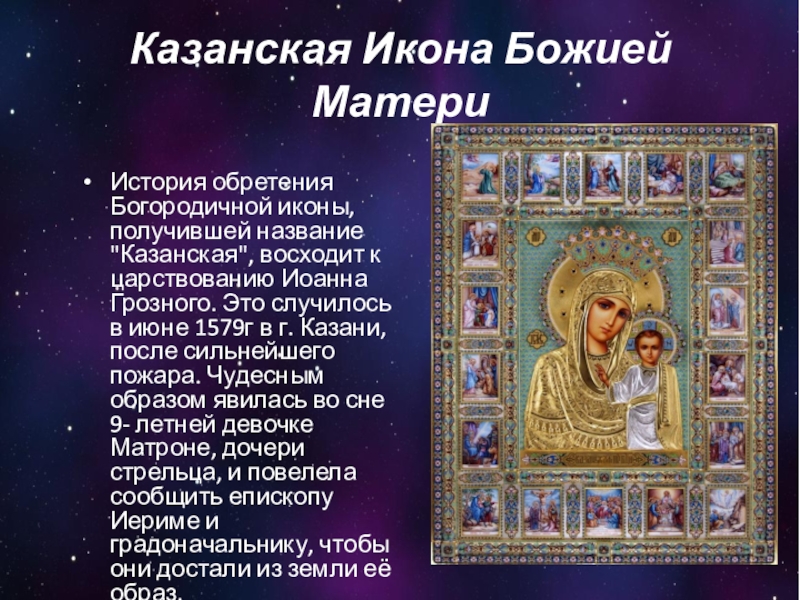 Казанская Икона Божией МатериИстория обретения Богородичной иконы, получившей название "Казанская", восходит к царствованию Иоанна Грозного. Это случилось в июне 1579г в г. Казани, после сильнейшего пожара. Чудесным образом явилась во сне 9- летней девочке Матроне, дочери