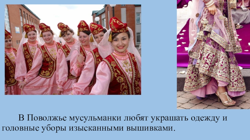 Слайд 23 В Поволжье мусульманки любят украшать одежду и