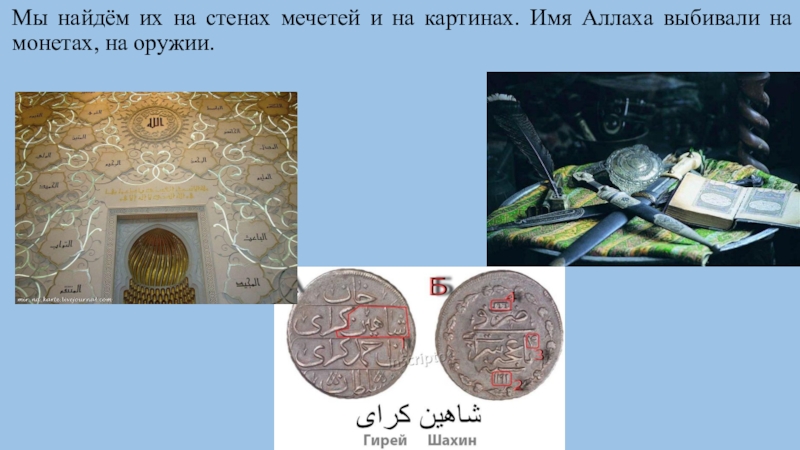 Слайд 6Мы найдём их на стенах мечетей и на картинах. Имя Аллаха