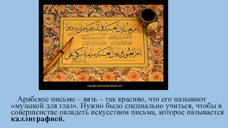 Слайд 7 Арабское письмо – вязь – так красиво, что